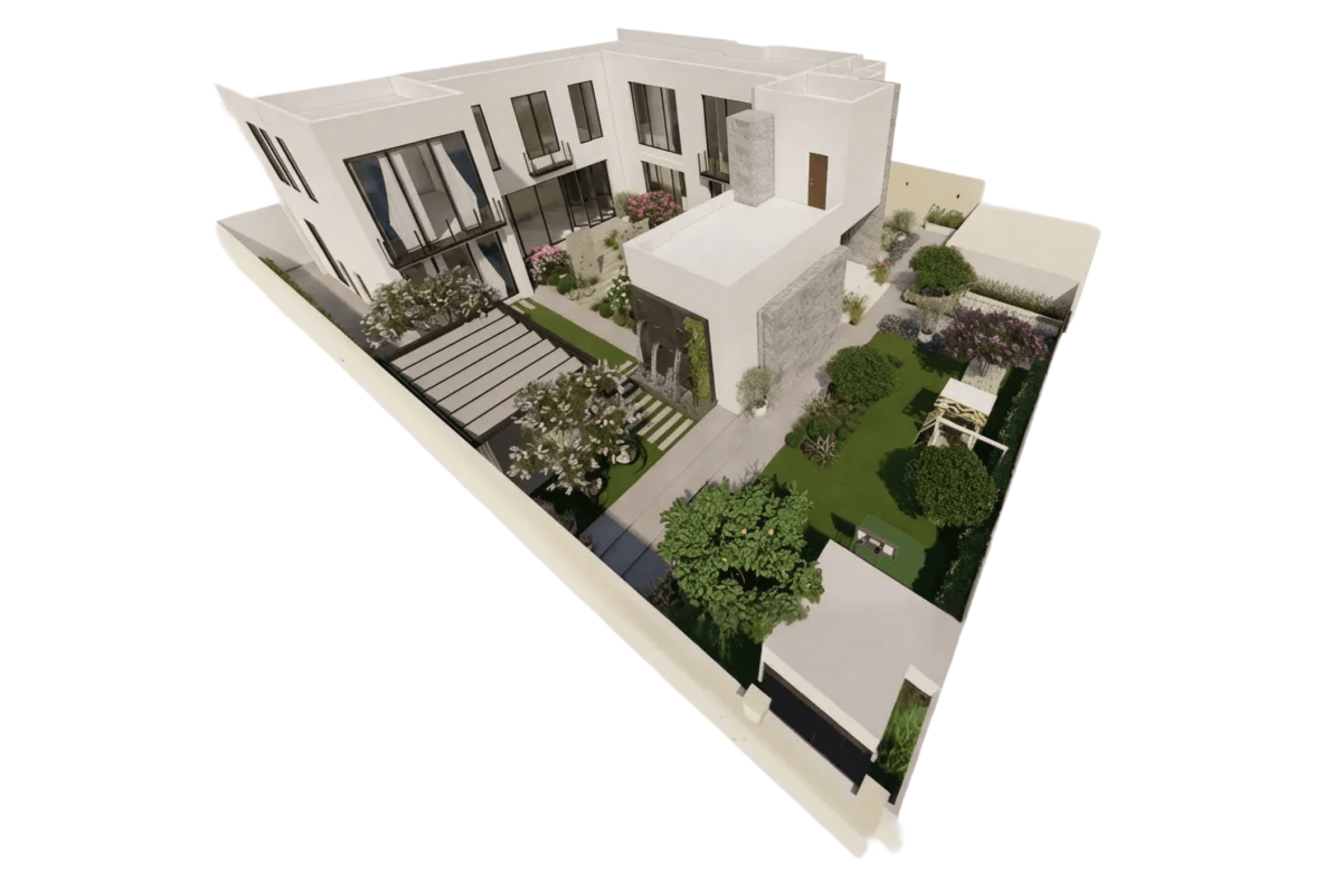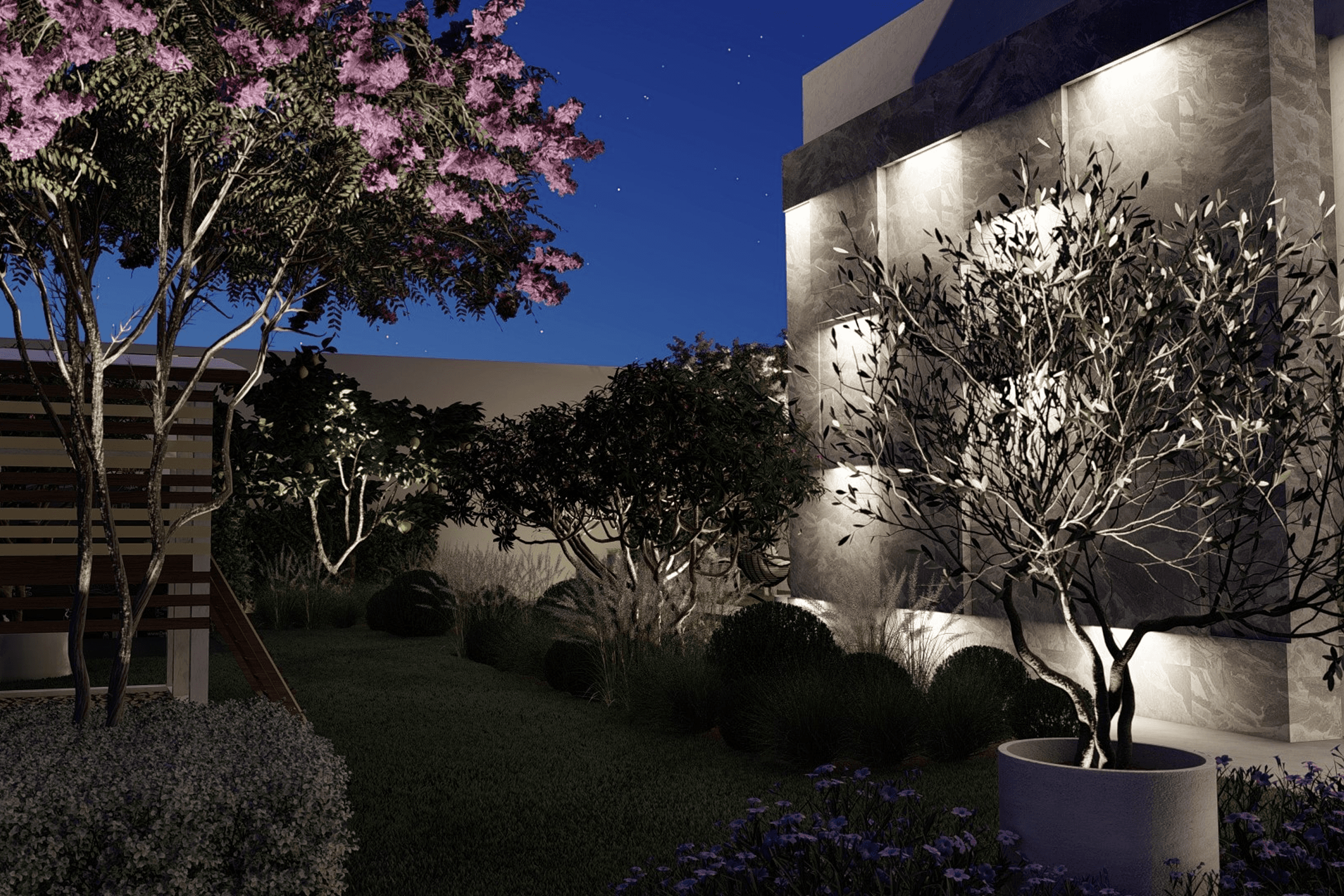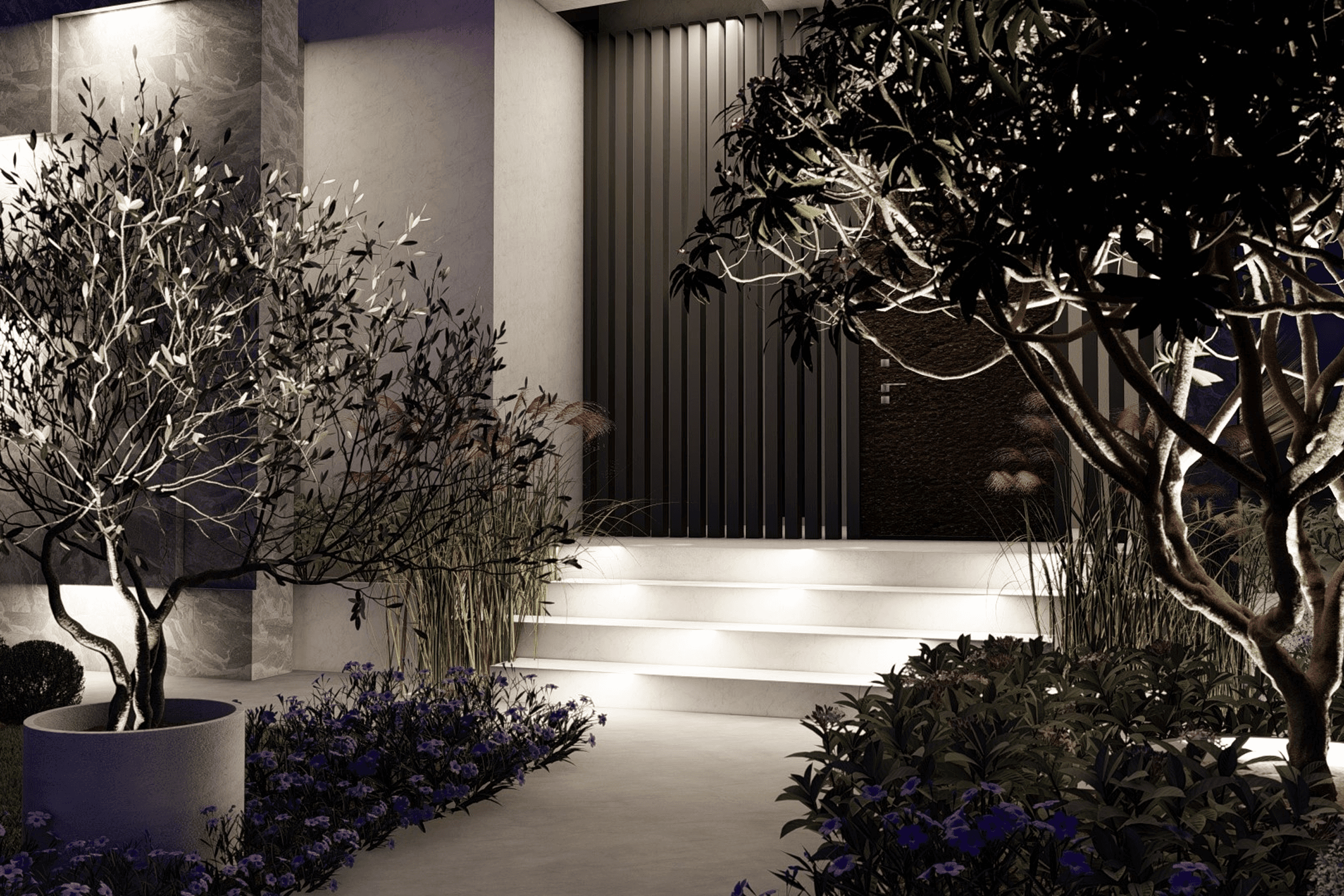 Неотъемлемой частью также стал водопад из стены дома с золотыми фламинго и уютная зона барбекю. Для того, чтобы изучить ассортимент, мы посетили питомники в Дубае и побывали в современных пространствах, созданных местными ландшафтными архитекторами. Все растения подобраны из реального ассортимента и мы надеемся, что будут радовать заказчика долгие годы.
