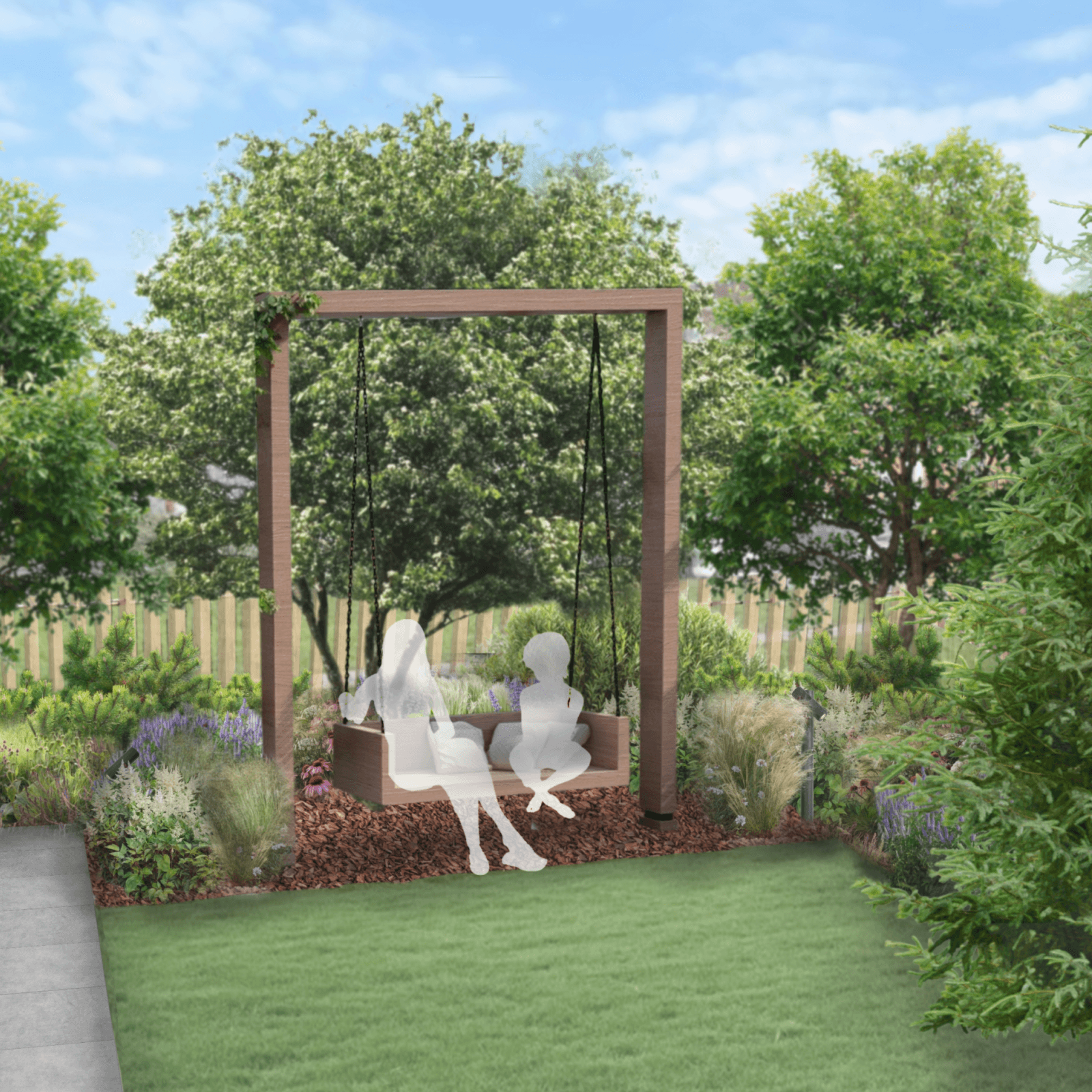 Если говорить о стиле в этом саду, то за основу мы взяли лаконичность, порядок, но при этом природные формы. Эклектика модерна и натуральности. В окружении шелеста листьев, ароматов цветов и дерева можно восстановить жизненные силы и вдохновиться на творчество. Изюминкой этого проекта стало комбинированное мощение, которое разбавило монотонность длинной прямой дорожки, идущей ко входу в дом. В основу мощения встала тротуарная плитка в светлых оттенках квадратной формы, разбавленная мелкой брусчаткой.